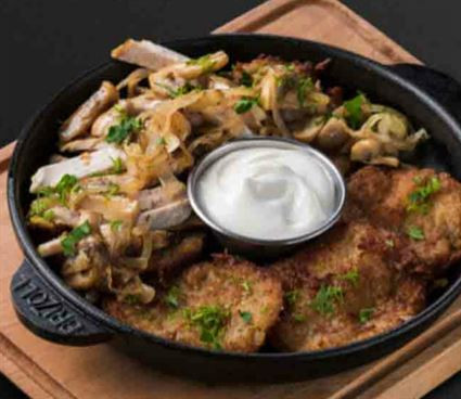 Картопля в кожурі під сирним соусом і смаженими грибами.